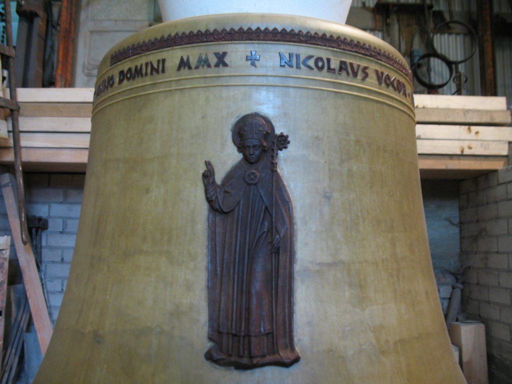 Het embleem van de heilige Nicolaas is door Laudy gekopieerd van de Nicolaasklok uit ’t Zandt (Gr.) Deze Van Wouklok heeft hetzelfde formaat als de nieuwe klok.